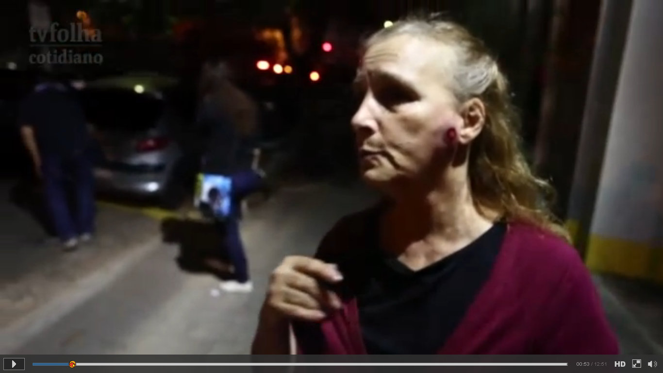 No dia 16 de junho, além da jornalista da Folha, a dona Maria, que estava andando pela praça Roosevelt, também levou um tiro de borracha na cara “eu vou fazer uma ocorrência” disse ela, na mesma delegacia do meu bairro, onde fiz uma ocorrência por agressão, dos próprios policiais fascistas – ironia do universo.
