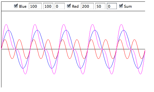 “Notice how the source waves and the resulting complex wave are periodic — they repeat in a regular pattern. This is what happens when two waves are harmonically related (whole number multiples of each other) to the fundamental (or lowest) frequency. When two waves aren’t multiples, you get noise”